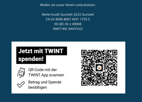 Wollen sie unser Verein unterstützen:Reitermusik Gunzwil, 6222 Gunzwil CH 65 8080 8007 4591 1735 0IID (BC-Nr.): 80808SWIFT-BIC RAIFCH22